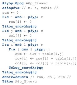 2. Δίδεται ο δισδιάστατος πίνακας table με m γραμμές n στήλες. Να βρεθεί το άθροισμα κατά γραμμή, κατά στήλη και συνολικά.