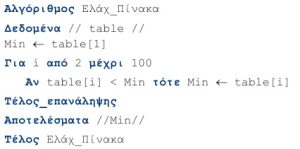 1. Δίνεται ένας μονοδιάστατος πίνακας table 100 στοιχείων. Να σχεδιασθεί αλγόριθμος που να βρίσκει το μικρότερο στοιχείο του.