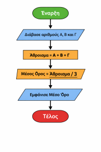 Για παράδειγμα, αν θέλουμε να υπολογίσουμε τον μέσο όρο τριών αριθμών, το flowchart μπορεί να περιλαμβάνει τα παρακάτω βήματα: