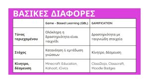 Στο συνεχώς εξελισσόμενο τοπίο της εκπαίδευσης, δύο έννοιες ξεχωρίζουν για τις καινοτόμες προσεγγίσεις της μάθησης: η Μάθηση Βασισμένη στο Παιχνίδι (GBL) και η παιχνιδοποίηση. Ενώ και οι δύο έννοιες χρησιμοποιούν στοιχεία παιχνιδιών για να βελτιώνουν τη μαθησιακή εμπειρία, οι εφαρμογές και τα οφέλη τους διαφέρουν σημαντικά.Στον πίνακα που ακολουθεί αποτυπώνονται οι σημαντικότερες διαφορές.