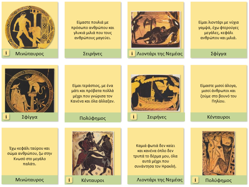 Είναι ένα διαδραστικό εκπαιδευτικό παιχνίδι μνήμης (memory game) από το Πανελλήνιο Ψηφιακό Αποθετήριο "Φωτόδεντρο". Στην οθόνη εμφανίζονται κάρτες γυρισμένες ανάποδα. Οι μαθητές καλούνται να ανοίγουν τις κάρτες ανά δύο, προσπαθώντας να βρουν τα ζευγάρια που ταιριάζουν. Κάθε ζευγάρι αποτελείται από την εικόνα ενός γνωστού τέρατος της ελληνικής μυθολογίας (όπως η Μέδουσα, ο Μινώταυρος, η Λερναία Ύδρα, ο Κέρβερος) και την κάρτα με το όνομά του.