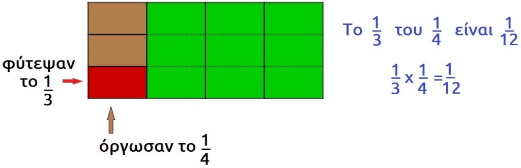 Στο πρόβλημα είδαμε ότι "...Φέτος όργωσαν το 1/4 του χωραφιού τους και μετά φύτεψαν ντομάτες στο 1/3 του οργωμένου μέρους." Παρατηρήσαμε οτι το 1/3 του 1/4 είναι το 1/12 ολόκληρου του οικοπέδου και η επίλυση του προβλήματος αναπαραστάθηκε με πολλαπλασιασμό κλασμάτων .