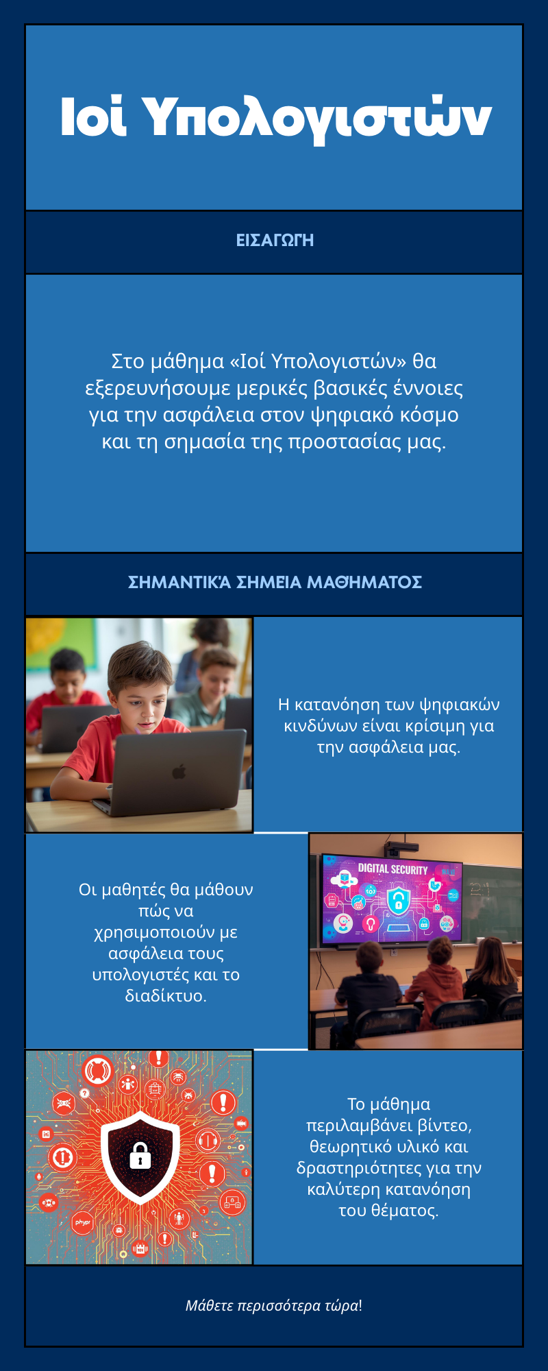 Το μάθημα απευθύνεται σε μαθητές Δευτεροβάθμιας Εκπαίδευσης και έχει στόχο να βοηθήσει τους μαθητές να κατανοήσουν κινδύνους που μπορεί να συναντήσουν στην καθημερινή χρήση του υπολογιστή και του διαδικτύου.